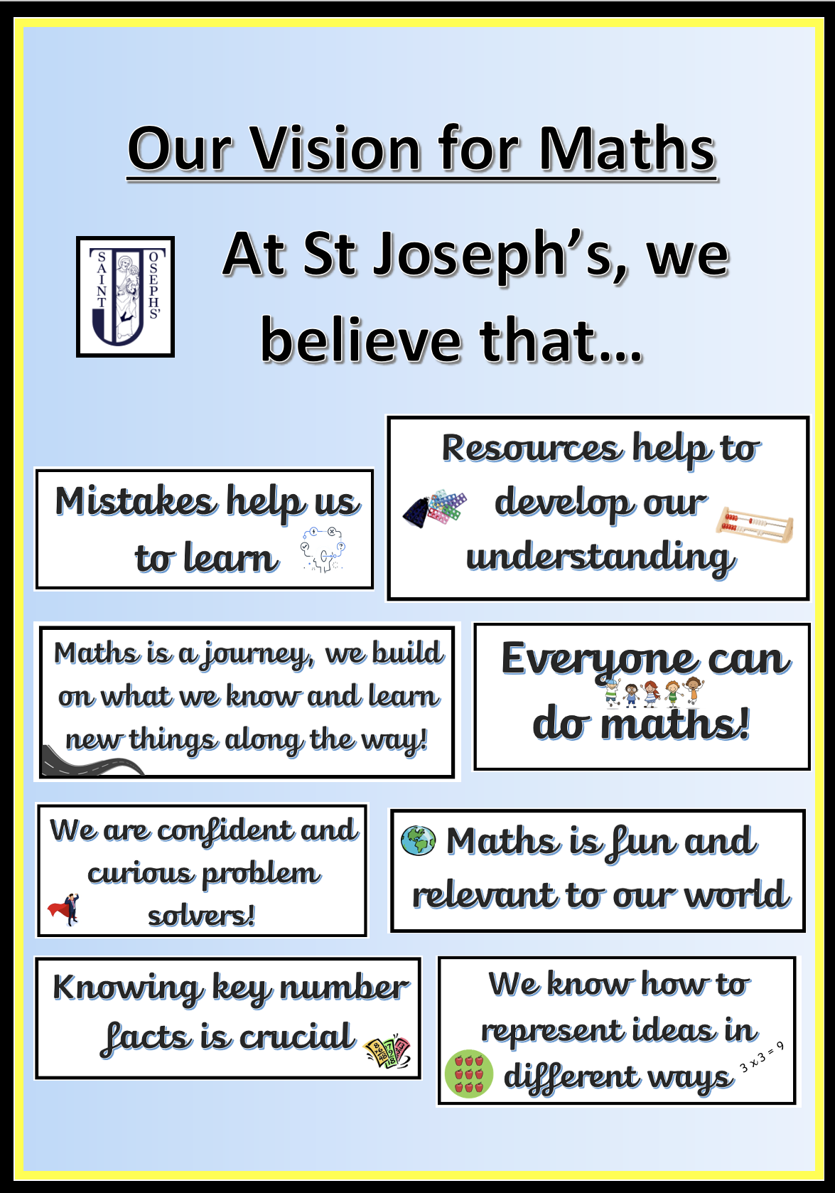 At St Joseph’s, these skills are embedded within Maths lessons and developed consistently over time. We are committed to ensuring that children are able to recognise the importance of Maths in the wider world and that they are also able to use their mathematical skills and knowledge confidently in their lives in a range of different contexts. We want all children to enjoy Mathematics and to experience success in the subject, with the ability to reason mathematically. We are committed to developing children’s curiosity about the subject, as well as an appreciation of the beauty and power of Mathematics.