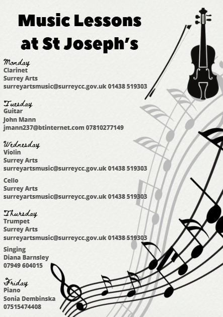 We are very lucky at St Joseph’s to be able to offer a variety of musical instrument lessons during the school day.