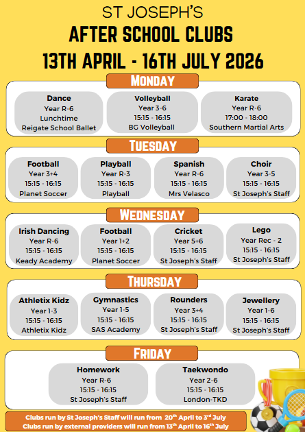 We offer a wide variety of lunchtime and after-school clubs for children of all ages at St Joseph's. The club timetable is sent to parents at the end of every term, in preparation for the next term. Our clubs are run by both external providers and our St Joseph's staff.
