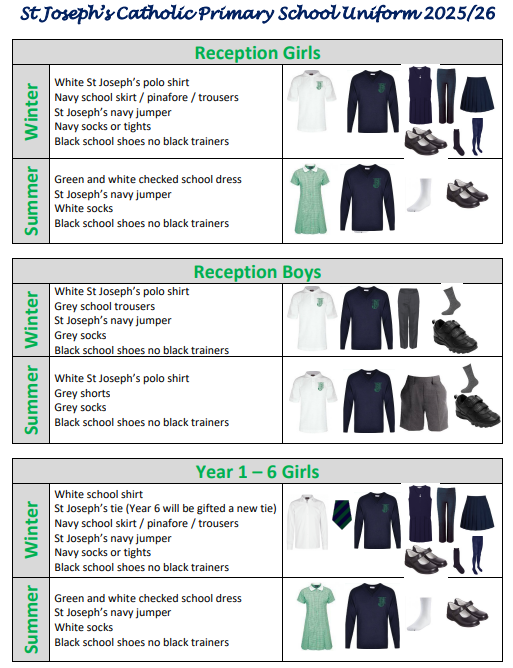 At St Joseph’s, we believe that wearing the correct uniform helps foster a sense of belonging, pride, and readiness to learn. It reflects the value we place on education and the importance of being part of our school community.